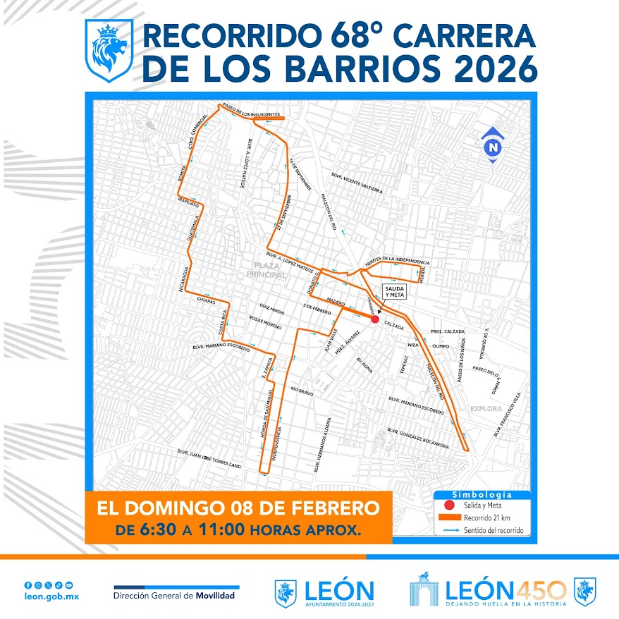 El Gobierno Municipal de León implementará cierres viales temporales por la Carrera Atlética de los Barrios. La competencia se realizará el domingo 8 de febrero, de 06:00 a 10:00 horas. La medida busca proteger a participantes, peatones y automovilistas.